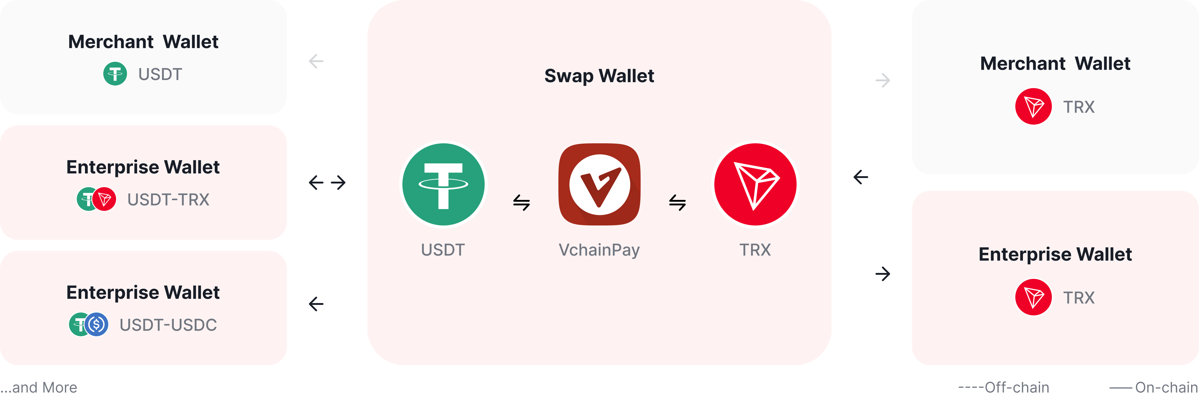 VchainPay supports swaps between major cryptocurrencies and selected blockchain-based tokens across supported networks. The list of available tokens may expand over time based on liquidity, network stability, and market demand.